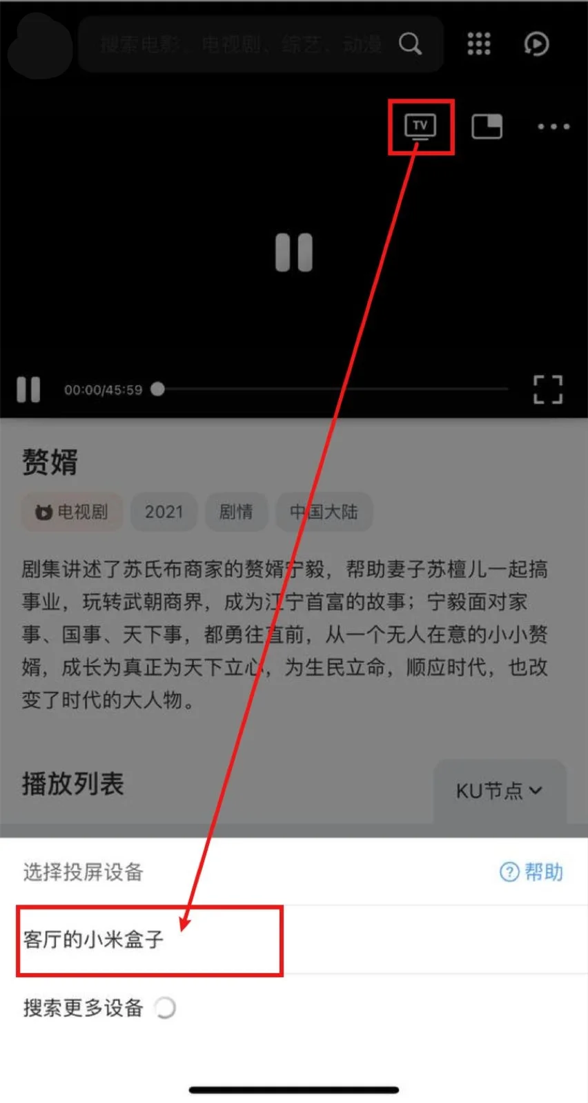 打开QQ浏览器(会接管网页播放器)->打开星河影院->播放视频->选中投屏图标->等待搜寻出智能电视/电视盒子->选中,即可投屏。